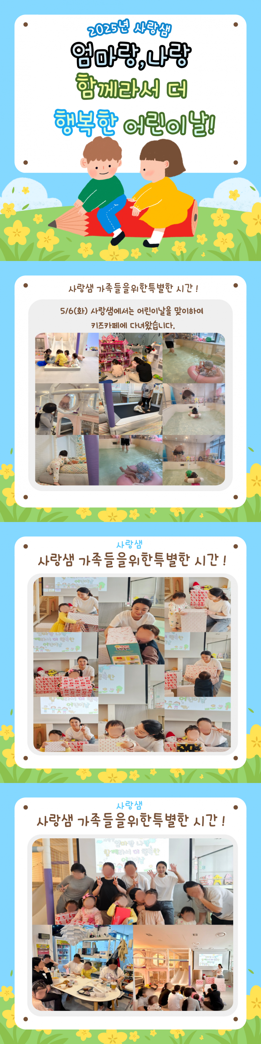 가정의 달 5월, 어린이날을 맞아 아이들과 함께 키즈카페에 다녀왔습니다!신나게 뛰놀고, 웃음 가득한 시간을 보내며 즐거운 추억을 만들었습니다.앞으로도 아이들이 행복한 시간을 보낼 수 있도록 노력하겠습니다.