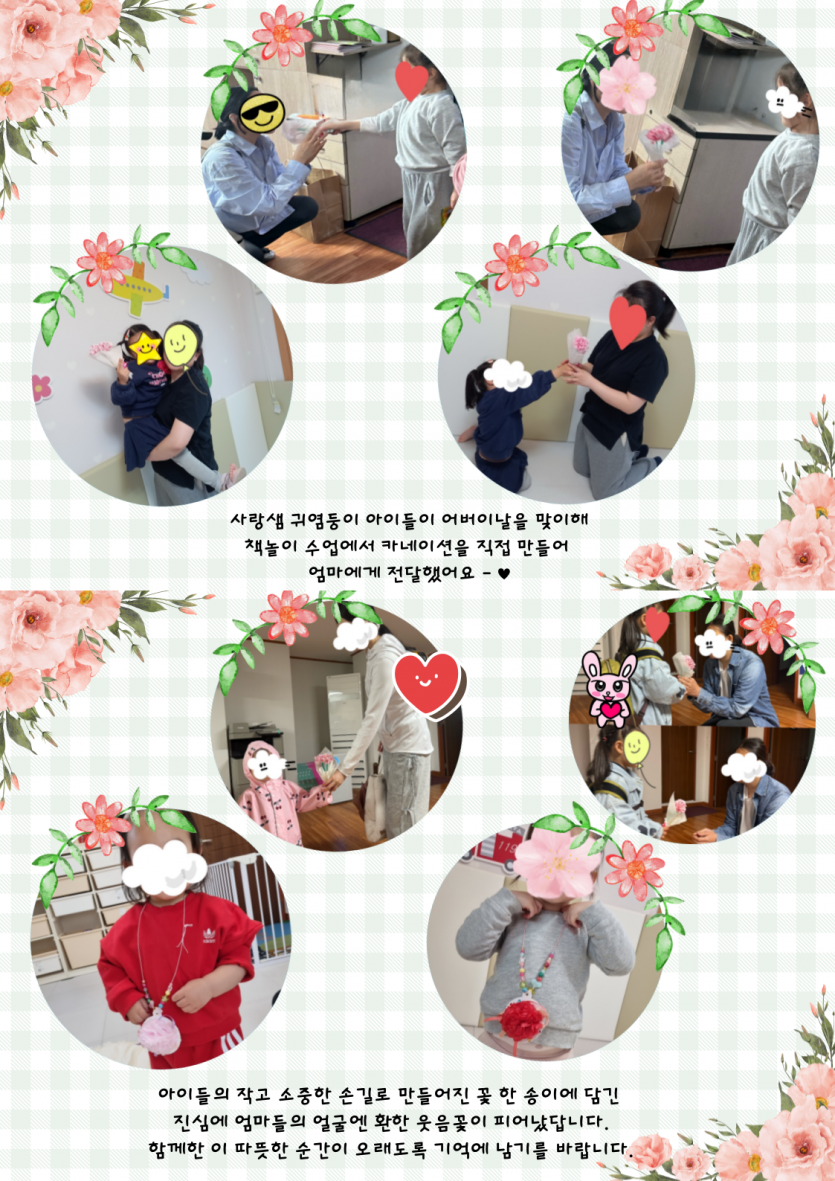 어버이날을 맞아 아이들이 직접 고사리손으로 정성껏 꽃을 만들어 엄마에게 전했어요.작은 손으로 전한 꽃 한 송이에는 “사랑해요”, “고마워요”라는 마음이 가득 담겨 있었답니다.꽃보다 고운 아이들의 마음에 엄마들의 얼굴엔 환한 웃음이 피어나던 소중한 순간이었습니다.