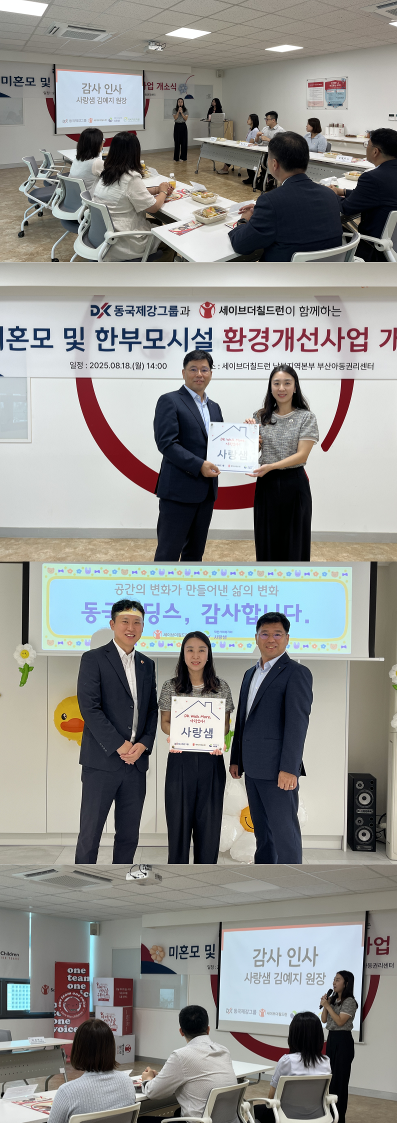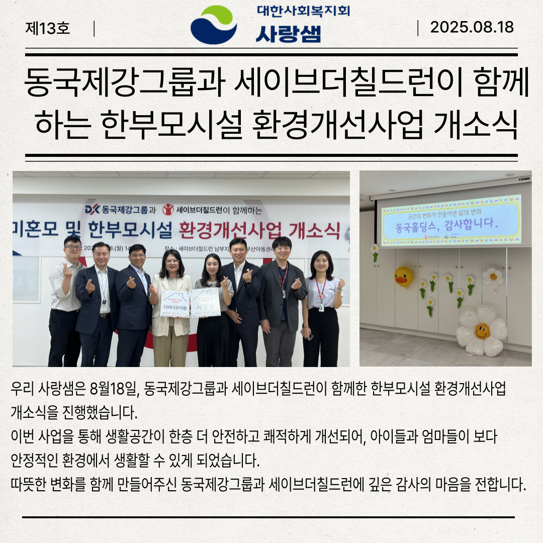 8월18일 동국제강그룹과 세이브더칠드런이 함께한 한부모시설환경개선사업 개소식을 진행했습니다.이번사업을 통해 생활공간이 한층 더 안전하고 쾌적하게 개선되어아이들과 엄마들이 보다 안정적인 환경에서 생활할 수 있게 되었습니다.따뜻한 변화를 함께만들어주신 동국제강그룹과 세이브더칠드런에 깊은 감사를 드립니다.