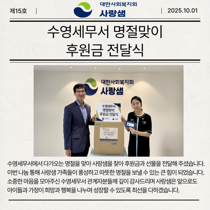 [나눔] 수영세무서 명절맞이 기부 사랑샘관리자 0 454 2025.10.02 13:15 수영세무서에서 명절을 맞아 사랑샘 가족들에게 후원금과 선물을 전달해 주셨습니다. 따뜻한 마음 덕분에 사랑샘가족들은 더욱 풍성한 명절을 보낼 수 있게 되었습니다. 감사합니다^^